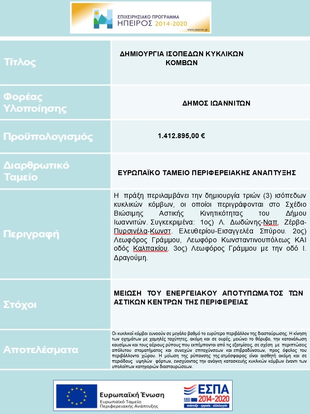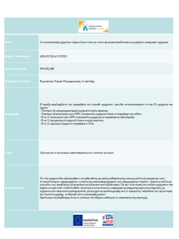 | «Αντικατάσταση οχημάτων Δήμου Ιωαννιτών με νέα ενεργειακά αποδοτικά και χαμηλών εκπομπών οχήματα» | Η πράξη περιλαμβάνει την προμήθεια οχημάτων, που θα αντικαταστήσουν εννέα (9) οχήματα του Δήμου | |