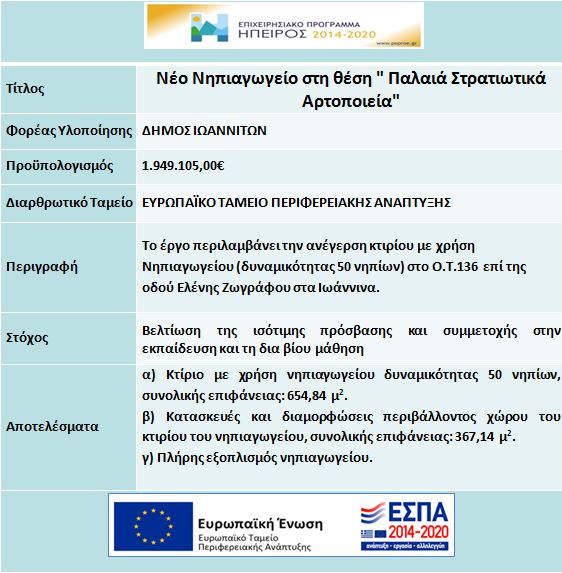 | ΝΕΟ ΝΗΠΙΑΓΩΓΕΙΟ ΣΤΗΝ ΘΕΣΗ “ΠΑΛΑΙΑ ΣΤΡΑΤΙΩΤΙΚΑ ΑΡΤΟΠΟΙΕΙΑ” | Το έργο περιλαμβάνει στην ανέγερση κτιρίου με χρήση Νηπιαγωγείου (δυναμικότητας 50 νηπίων) στο Ο.Τ.136 επί της οδού Ελένης Ζωγράφου στα Ιωάννινα. | – |