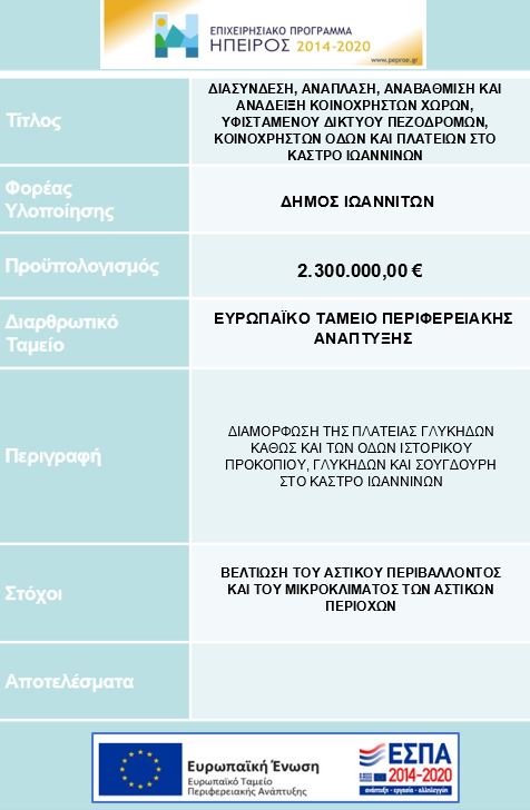 | «Επιχειρησιακό Πρόγραμμα Επισιτιστικής και Βασικής Υλικής Συνδρομής» του Ταμείου Ευρωπαϊκής Βοήθειας προς τους Απόρους (ΤΕΒΑ) 2014-2020» | Αναπλάσεις Οδών σε Πεζόδρομους και Οδούς Ήπιας Κυκλοφορίας σε τμήμα του Ιστορικού Κέντρου των Ιωαννίνων (μεταξύ Ανεξαρτησίας, Αγ. Νικολάους, Κουντουριώτη και Χάλαρη) | – |