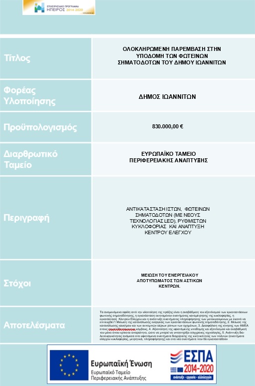 | ΟΛΟΚΛΗΡΩΜΕΝΗ ΠΑΡΕΜΒΑΣΗ ΣΤΗΝ ΥΠΟΔΟΜΗ ΤΩΝ ΦΩΤΕΙΝΩΝ ΣΗΜΑΤΟΔΟΤΩΝ ΤΟΥ ΔΗΜΟΥ ΙΩΑΝΝΙΤΩΝ | – | – |